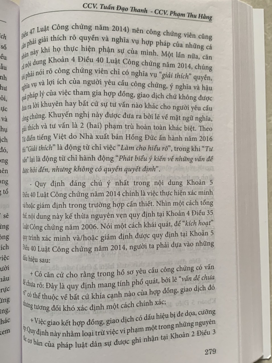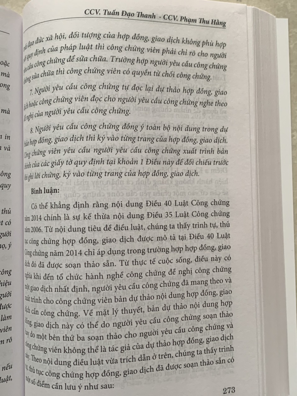 Trong mỗi chương các tác giả đều trình bày nhận xét tổng quan, tiếp đó phân tích, bình luận từng điều luật dựa trên kinh nghiệm hành nghề thực tế của bản thân xuất phát từ yêu cầu, đòi hỏi khách quan của cuộc sống và được so sánh với nội dung những văn bản quy phạm pháp luật điều chỉnh một số lĩnh vực có liên quan mật thiết đến hoạt động công chứng, đồng thời đề cập một số quan điểm còn có thể có ý kiến đa chiều để bạn đọc tiếp cận. Dù các tác giả đã dành sự tâm huyết và cố gắng trong quá trình biên soạn nhưng cuốn sách khó tránh khỏi những hạn chế, thiếu sót nhất định. Các tác giả và Nhà xuất bản rất mong nhận được ý kiến đóng góp của bạn đọc.