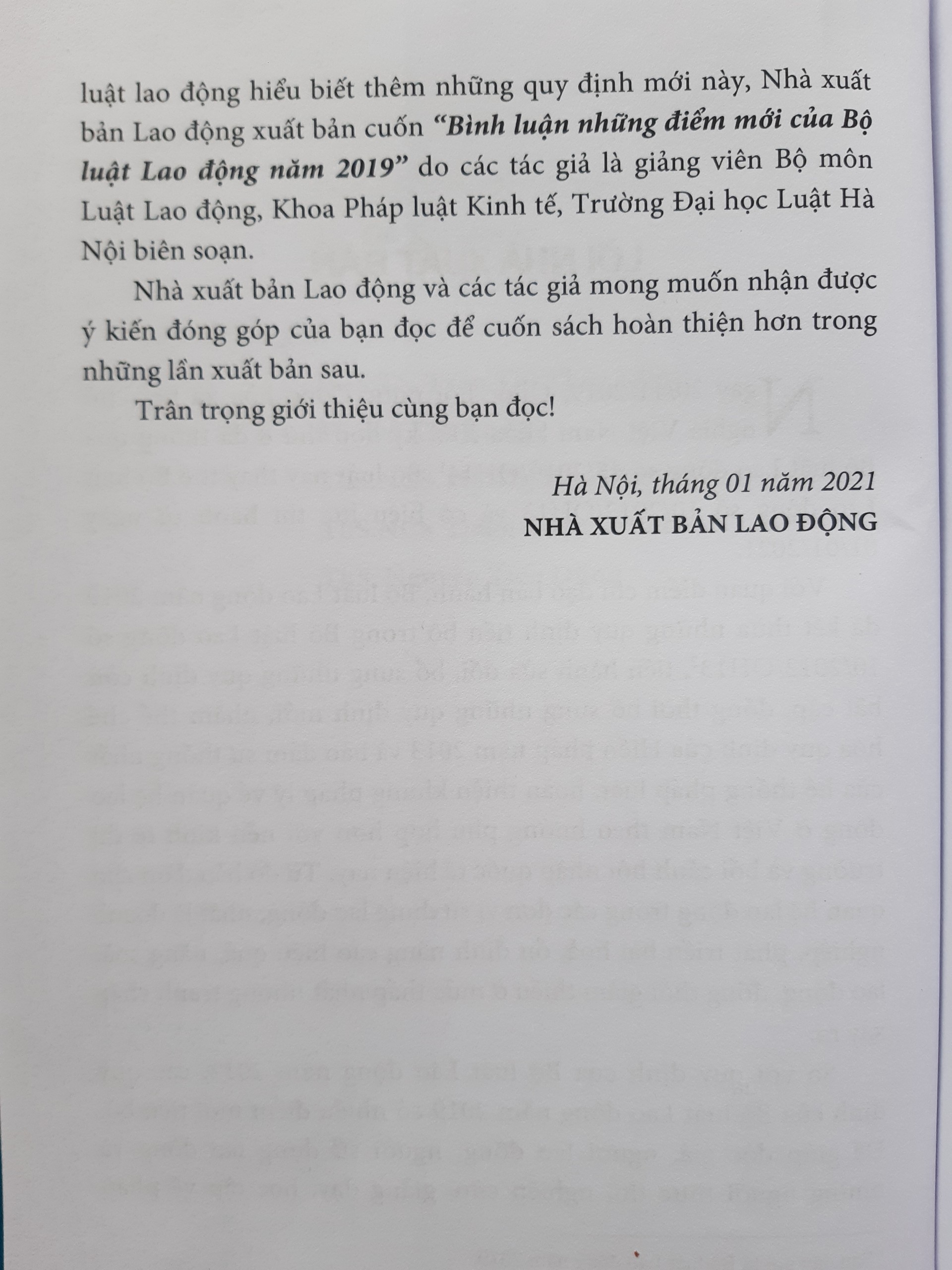Ngày 20/11/2019, Quốc hội nước Cộng hòa xã hội chủ TV nghĩa Việt Nam khóa XIV kỳ họp thứ 8 đã thông qua Bộ luật Lao động số 45/2014/QH14. Bộ luật này thay thế Bộ luật Lao động số 10/2012/QH13 và có hiệu lực thi hành từ ngày 01/01/2021. Với quan điểm chỉ đạo ban hành, Bộ luật Lao động năm 2019 đã kết thừa những quy định tiến bộ trong Bộ luật Lao động số 10/2012/QH133, tiến hành sửa đổi, bổ sung những quy định còn bất cập, đồng thời bổ sung những quy định mới, nhằm thể chế hóa quy định của Hiến pháp năm 2013 và bảo đảm sự thống nhất của hệ thống pháp luật, hoàn thiện khung pháp lý về quan hệ lao động ở Việt Nam theo hướng phù hợp hơn với nền kinh tế thị trường và bối cảnh hội nhập quốc tế hiện nay. Từ đó bảo đảm cho quan hệ lao động trong các đơn vị sử dụng lao động, nhất là doanh nghiệp, phát triển hài hoà, ổn định nâng cao hiệu quả, năng suất lao động, đồng thời giảm thiểu ở mức thấp nhất những tranh chấp xảy ra. So với quy định của Bộ luật Lao động năm 2012, các quy định của Bộ luật Lao động năm 2019 có nhiều điểm mới tiến bộ. Để giúp độc giả, người lao động, người sử dụng lao động và những người thực thi, nghiên cứu, giảng dạy, học tập về pháp luật lao động hiểu biết thêm những quy định mới này, Nhà xuất bản Lao động xuất bản cuốn “Bình luận những điểm mới của luật Lao động năm 2019” do các tác giả là giảng viên Bộ Luật Lao động, Khoa Pháp luật Kinh tế, Trường Đại học Luật Hà Nội biên soạn.