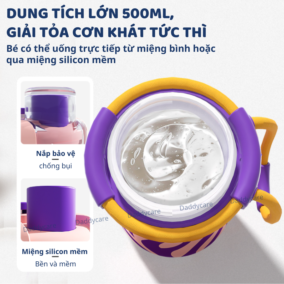 - BÌNH NƯỚC THỂ THAO CÓ DUNG TÍCH LỚN 500ML, GIẢI TỎA CƠN KHÁT TỨC THÌ: Bé có thể uống trực tiếp ở miệng bình giúp thỏa mãn cơn khát nhiều hơn, hoặc uống ở miệng silicon nhỏ và mềm. Bình có nắp để chống bụi cho miệng silicon.
