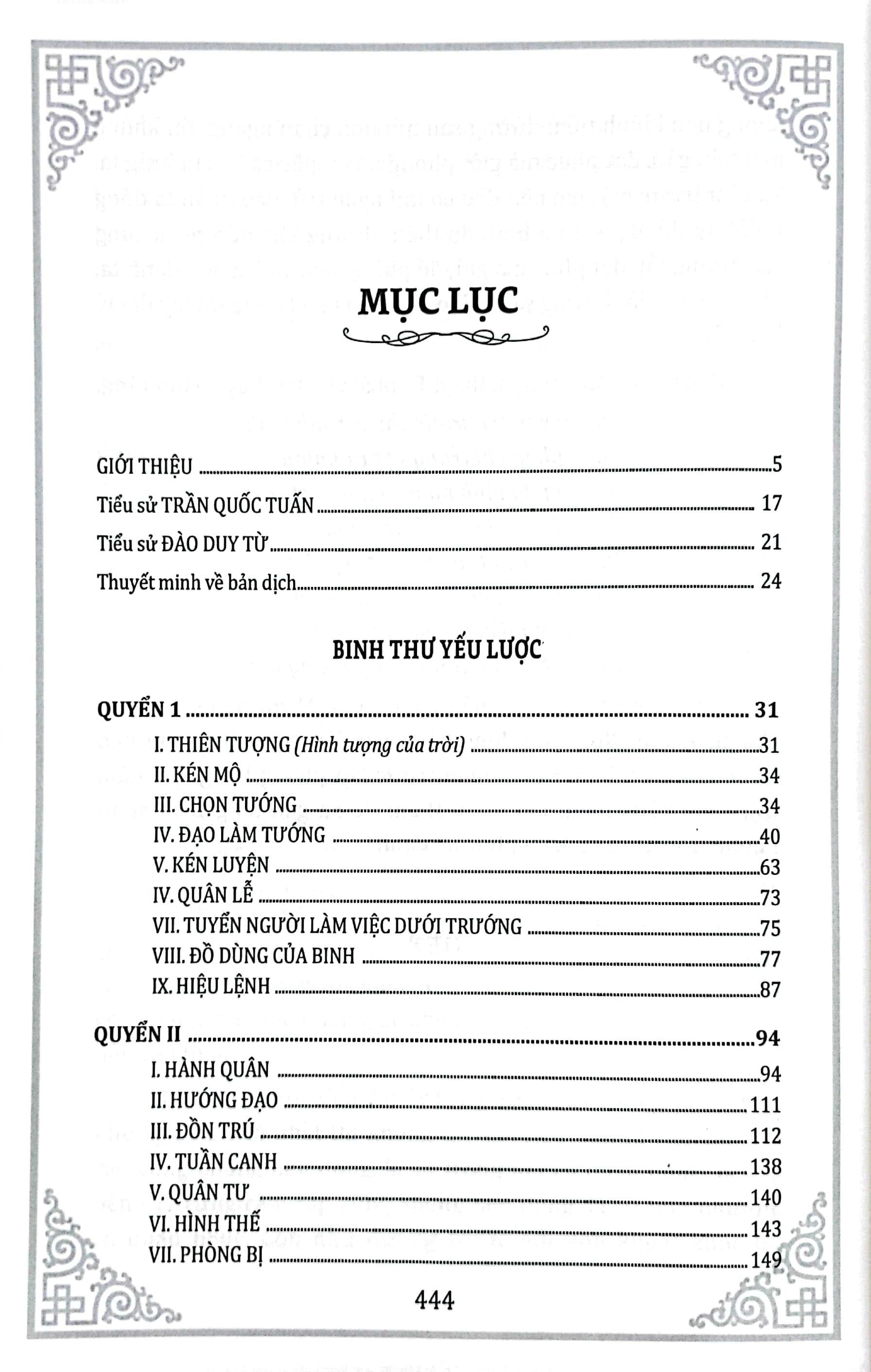 Binh Thư Yếu Lược mang ký hiệu 476 gồm bốn quyển. Quyển I gồm có chín chương, là: 1. Thiên tượng, 2. Tuyển mộ, 3. Tuyển tướng, 4. Tướng đạo, 5. Giản luyện, 6. Quân lễ, 7. Mạc hạ, B. Binh cụ, 9. Hiệu lệnh. Quyển II có mười một chương, là: T Hành quân, 2. Hướng đạo, 3. Đồn trú, 4. Tuần canh, 5. Quân tư, 6. Hình thế, 7. Phòng bị, 8. Xem mưa gió, 9. Binh trưng, 10. Dụng gián, 11. Dụng trá. Quyển III có bảy chương, là: 1. Liệu địch, 2. Dã chiến, 3. Quyết chiến, 4. Thiết kỳ, 5. Lâm chiến, 6. Sơn chiến, 7. Thủy chiến. Quyển IV cũng có bảy chương, là: 1. Công thành, 2. Thủ thành, 3. Đột vây, 4. Cứu ứng, 5. Lui tránh, 6. Được thua, 7. Đầu hàng.