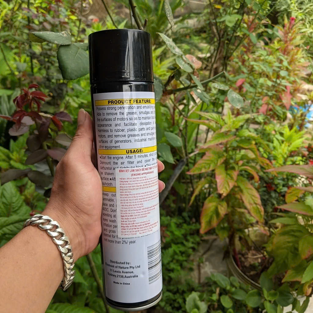 Xịt trực tiếp dung dịch lên khu vực cần vệ sinh (lốc máy, khoang động cơ, các bộ phận kim loại bám dầu mỡ).