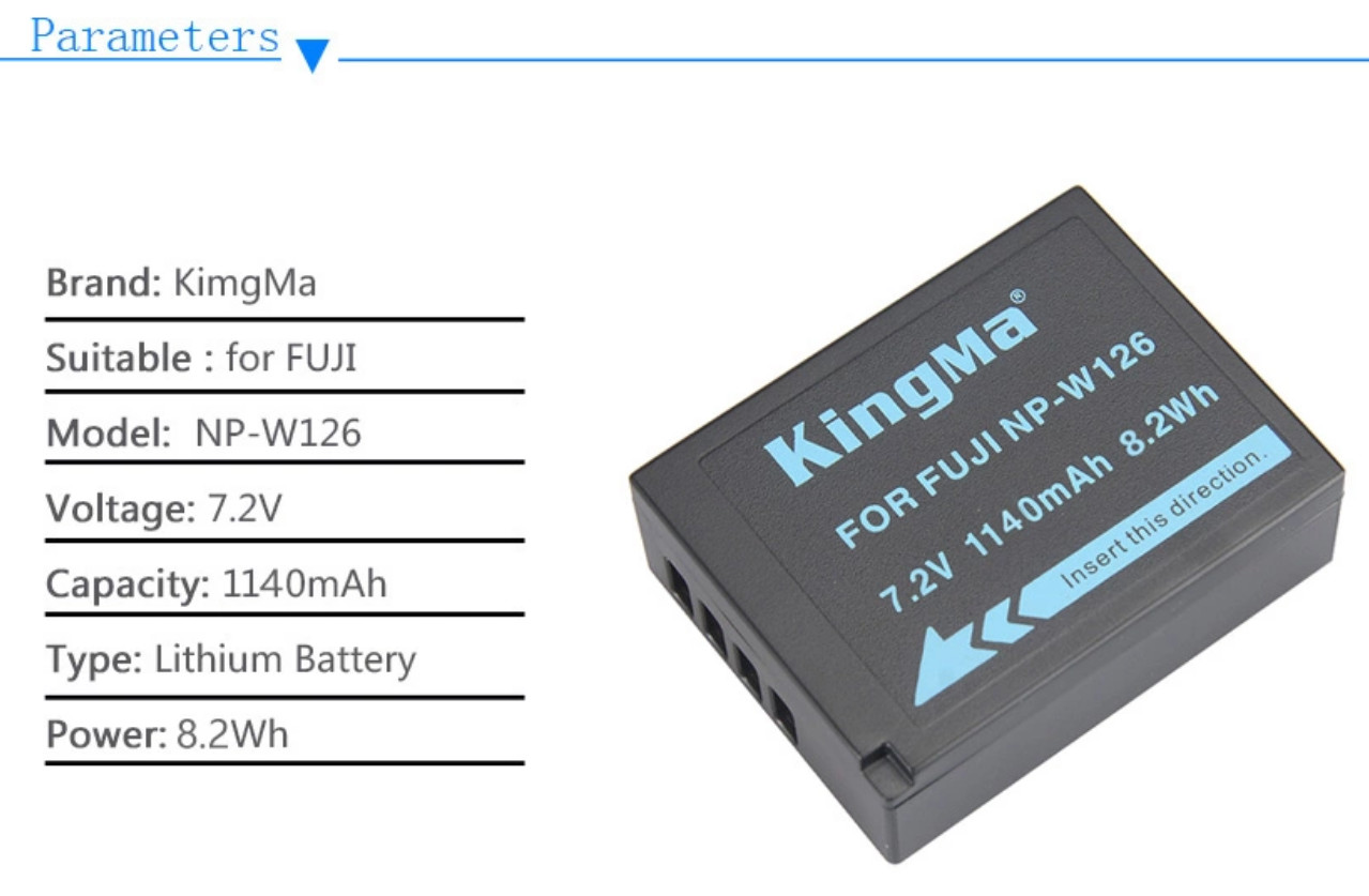 - Pin KingMa NP-W126 ,dùng cho tất cả các máy Fujifilm dùng pin này như: XT1 / XT10 / XE2 / XE1 / XA1/ XA2/ XA3/ X-PRO1/X-PRO2/X100F/ X-A1/X-A2/X-A3/X-E1/X-E2/X-E2S/X-E3…