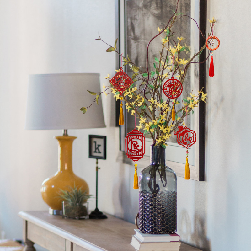 Bộ 05 phụ kiện dây treo Nguyệt hoa đăng đỏ, nổi bật với chất liệu gỗ khắc CNC, điểm xuyến bởi các hạt đỏ. Dây treo được làm thủ công sắc sảo. Là điểm nhấn