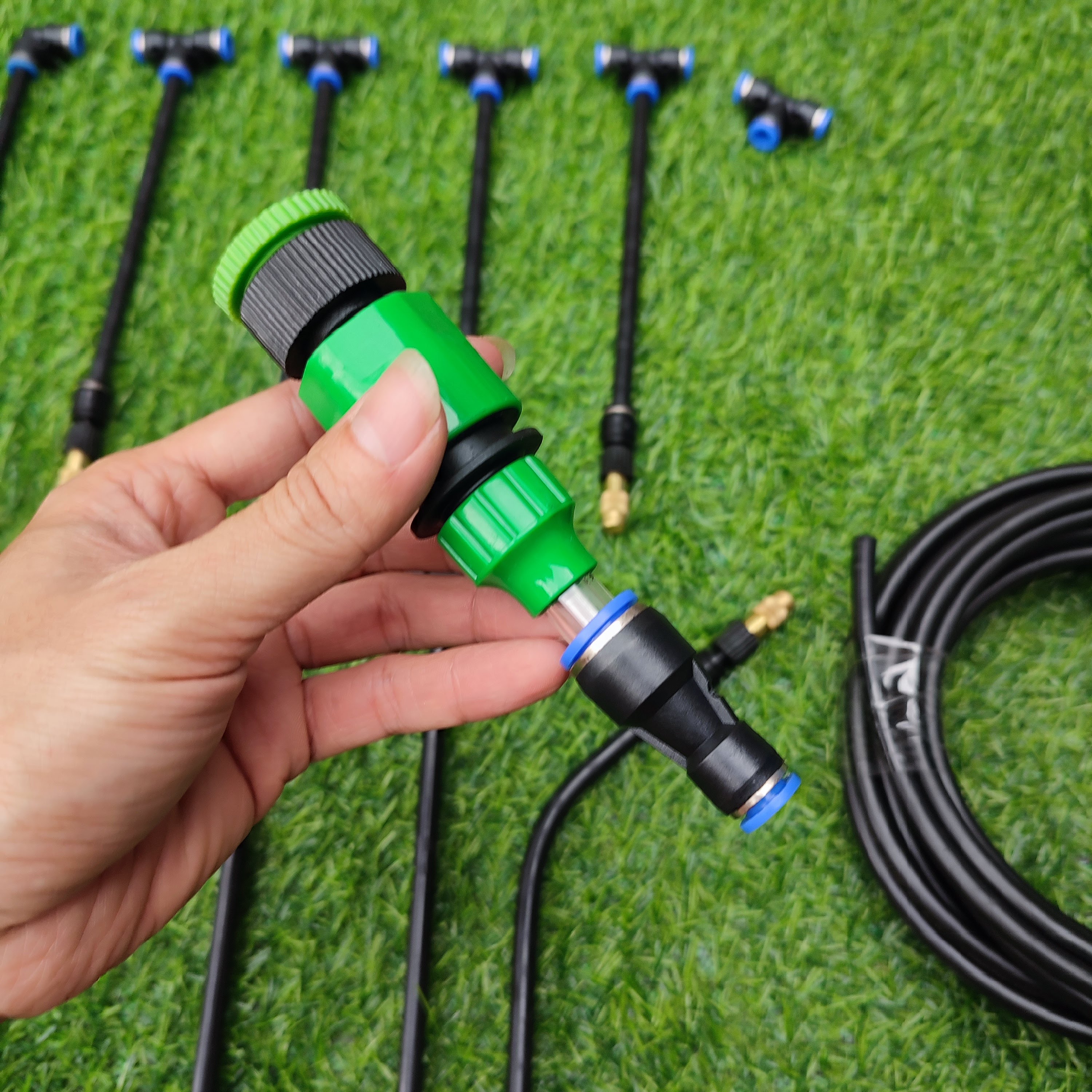 Mua tại TiktokBộ 15 béc phun sương tưới cây kèm 20m ống có cút nối vòi nước Chân tê nối ống phun sương 8mm Thân béc là ống kẽm bọc nhựa giúp uốn cong theo hướng cần tưới Đầu nối với vòi nước có khớp nối dạng ren trong 21mm hoặc 27mm, cùng cút nối nhanh vào khớp nối.