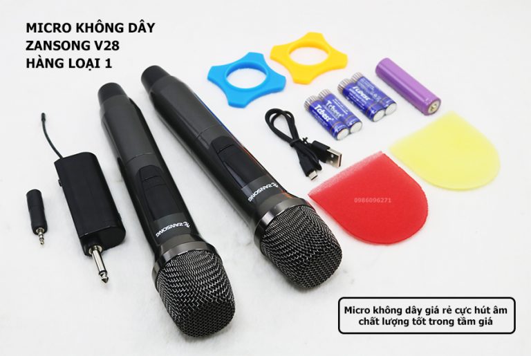 - Pin AA 1,5V cho micro: 4 cái Trọn bộ micro Zansong V28 Micro Zansong V28 đáp ứng đa dạng nhu cầu sử dụng3. Ứng Dụng của Micro không dây đầu thu mini Zansong V28 Kết hợp với các loại sound card, mixer, amply, vang số để hát karaoke online hoặc offline, thay thế các loại micro có dây. Kết hợp với loa kéo để tăng thêm số lượng micro hoặc làm micro dự phòng, thay thế. Kết hợp được với các dan âm thanh, loa trợ giảng để đáp ứng các nhu cầu khác nhau như giải trí, giảng dạy, đào tạo, hội nghị, hội thảo. Giải pháp không dây giá rẻ cho dàn karaoke gia đình, loại bỏ hạn chế của micro có dây.
