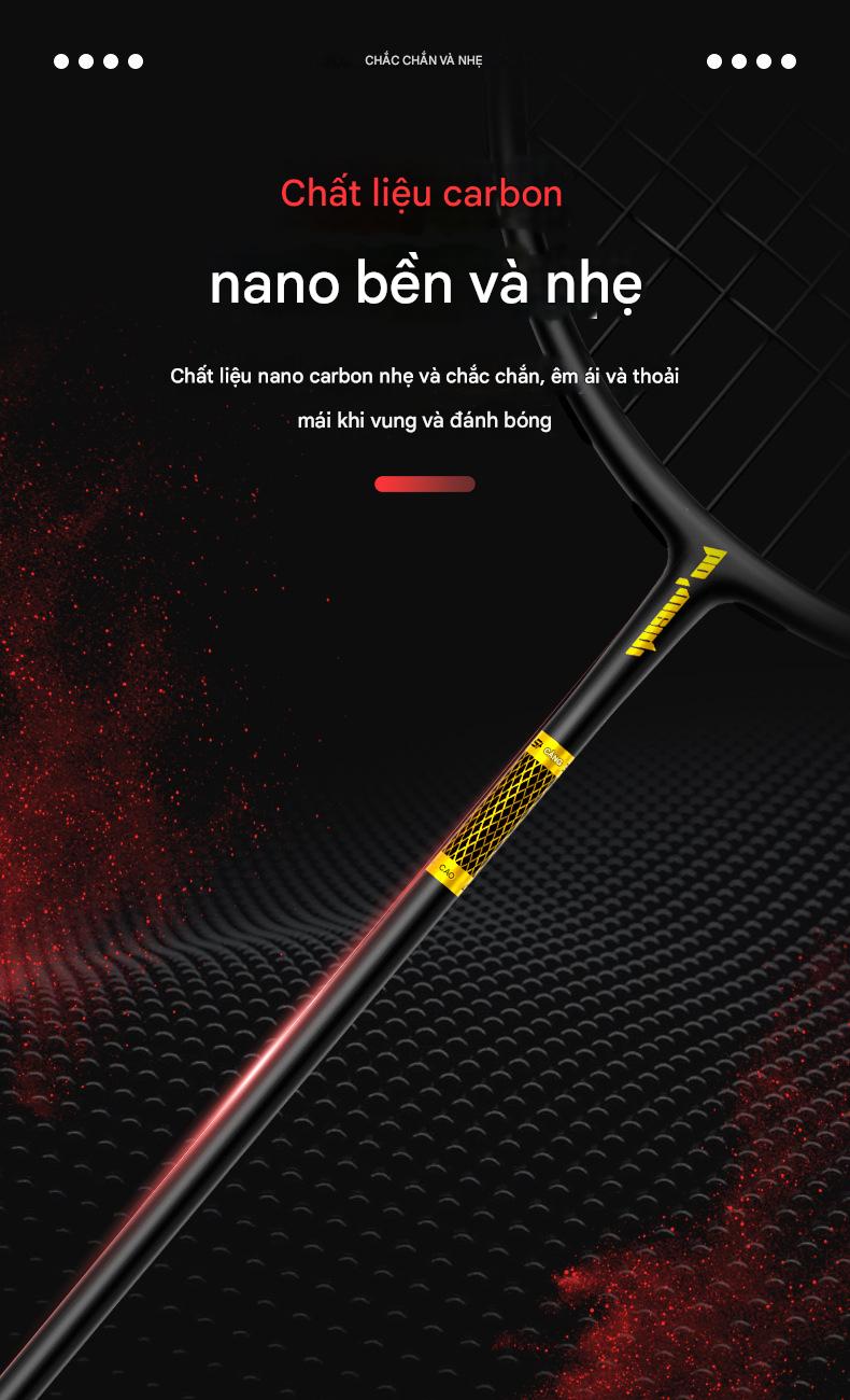 Thông số kỹ thuật: Chất liệu khung vợt: Carbon Fiber Chất liệu thân vợt: Carbon Fiber Trọng lượng: 3U (87+-3g ) Điểm cân bằng : 290+-4mm Độ đàn hồi : thân vợt dẻo Tay cầm