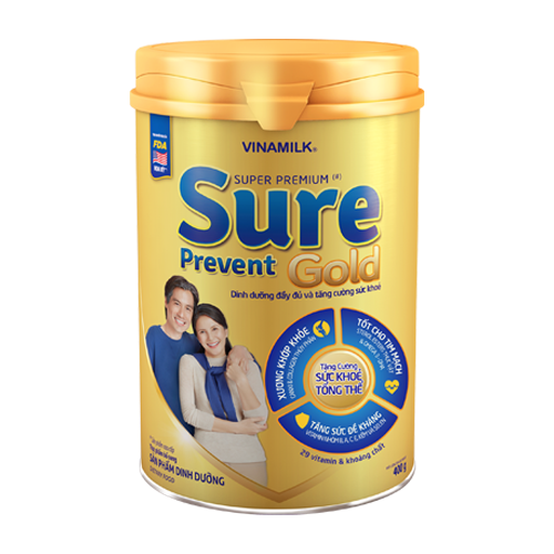 Giới thiệu Khi bước qua tuổi 50 người lớn tuổi thường gặp phải các vấn đề về sức khỏe và thiếu hụt dinh dưỡng. Thói quen dùng sữa để bổ sung dinh dưỡng cho người lớn chưa được quan tâm chú trọng đúng mức do một số quan niệm sai lầm về dinh dưỡng ở người lớn tuổi. Ở bất kỳ lứa tuổi nào, tình trạng chán ăn cũng có thể xảy ra. Tuy nhiên, đối tượng thường gặp tình trạng này nhất chính là người cao tuổi, do đó cần phải bổ sung giải pháp dinh dưỡng giúp cha mẹ ăn uống ngon miệng, có như vậy thì cơ thể mới hấp thụ được những dưỡng chất cần thiết, sức đề kháng tăng lên thì sức khỏe mới cải thiện. Người cao tuổi có xu hướng ăn ít hơn, ăn không thấy ngon miệng do những thay đổi sinh lý khi về già. Do đó, sữa dinh dưỡng là lựa chọn phù hợp cần được bổ sung vào chế độ dinh dưỡng hàng ngày để duy trì tình trạng sức khỏe tốt, sữa dành cho người lớn tuổi phải cung cấp đầy đủ, cân đối như: chất đạm, chất béo tốt, chất xơ, cholesterol thấp, vitamin và khoáng chất quan trọng khác. Sure Prevent Gold là món quà sức khỏe tuyệt vời dành tặng cho người thân yêu, đặc biệt là cha mẹ giúp bổ sung thêm dưỡng chất vào chế độ ăn nhằm duy trì và cải thiện tình trạng dinh dưỡng. Sure Prevent Gold giúp tăng cường sức khỏe tổng thể với dinh dưỡng dễ hấp thu bao gồm 29 vitamin và khoáng chất bổ sung vào chế độ ăn, đáp ứng 100% hàm lượng Plant Sterol theo khuyến nghị của FDA Hoa Kỳ, giúp phục hồi sức khỏe cho người bệnh, người cao tuổi, người ăn uống kém Thành phần và công dụng