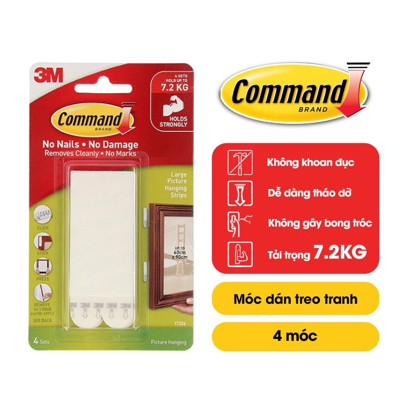 Miếng dán treo tranh Command, bám cực chắc, tháo cực dễ. Không khoang, không đục. Chịu lực 7,2kg. Một vỉ gồm 4 cặp miếng dán treo tranh Miếng dán treo tranh Command giúp cho việc