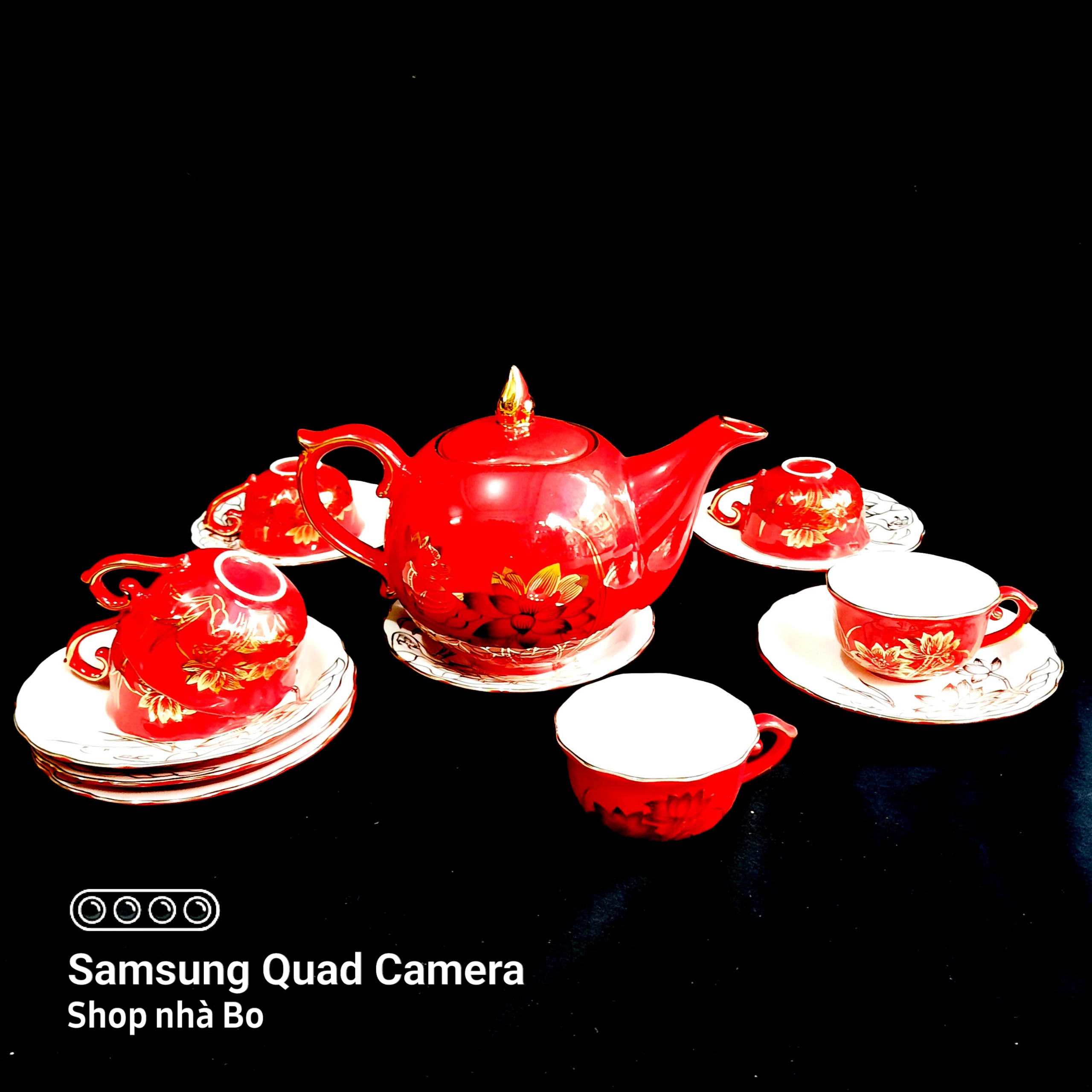 Bộ ấm chén Bát Tràng cao cấp mẫu đơn đỏ vẽ sen vàng được thiết kế hoàn toàn khác biệt, thích hợp với những người yêu thích màu đỏ. Phù hợp sử dụng trong các không gian sang trọng như phòng khách lớn, phòng hội họp… với bình trà lớn đáp ứng cho 8-10 người sử dụng. được chế tác tinh sảo rất tỉ mỉ do những nghệ nhân có kỹ thuật, tay nghề vô cùng điêu luyện có thể làm hài lòng nhữngkhách hàng khó tính nhất.