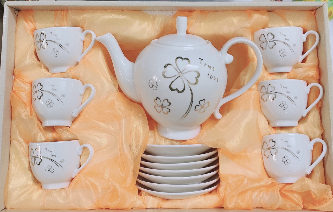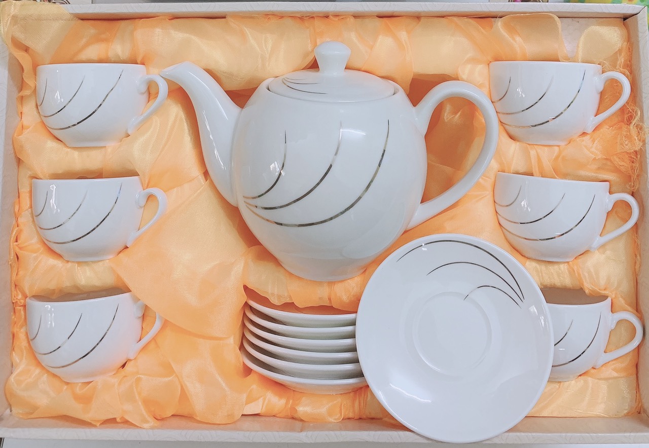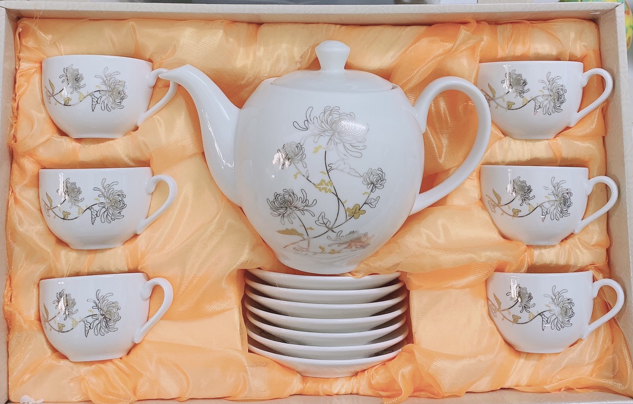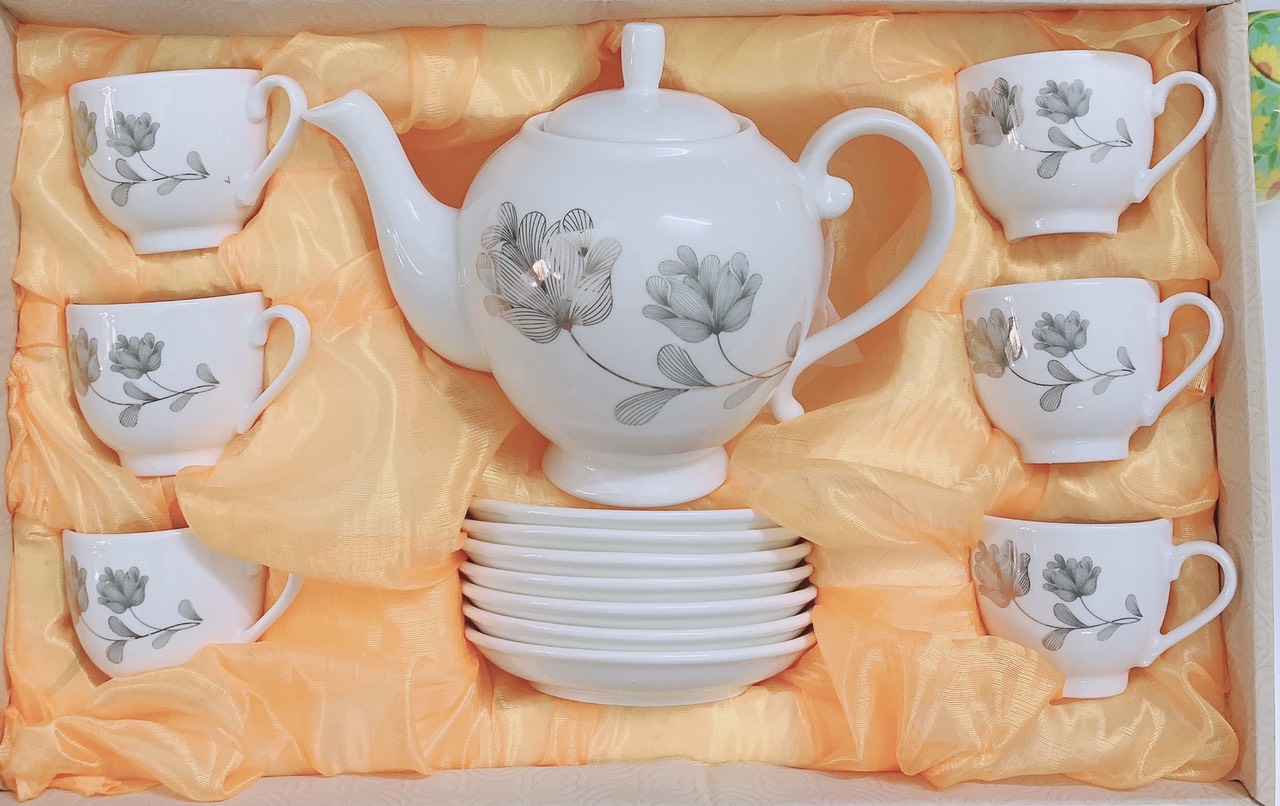Một bộ sản phẩm bao gồm: 01 ấm, 01 đĩa ấm, 06 chén và 06 đĩa chén.    Bộ sản phẩm được làm từ chất liệu gốm cao cấp, bảo đảm an toàn vệ sinh