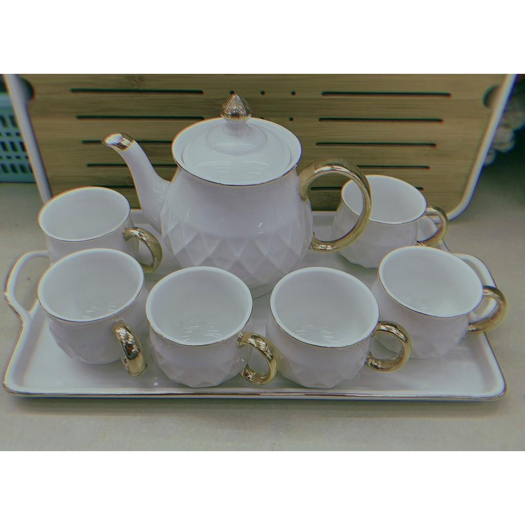 Một bộ sản phẩm bao gồm: 01 ấm, 01 đĩa ấm, 06 chén và 06 đĩa chén.    Bộ sản phẩm được làm từ chất liệu gốm cao cấp, bảo đảm an toàn vệ sinh