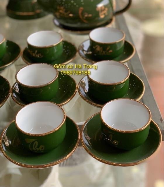 Bộ ấm chén Phúc Lộc Thọ dáng chóp men lục bảo vẽ vàng Gốm sứ Bát Tràng cao cấp Dung tích 430ml 1 ấm 6 chén 7 đĩa kê giá 650k
