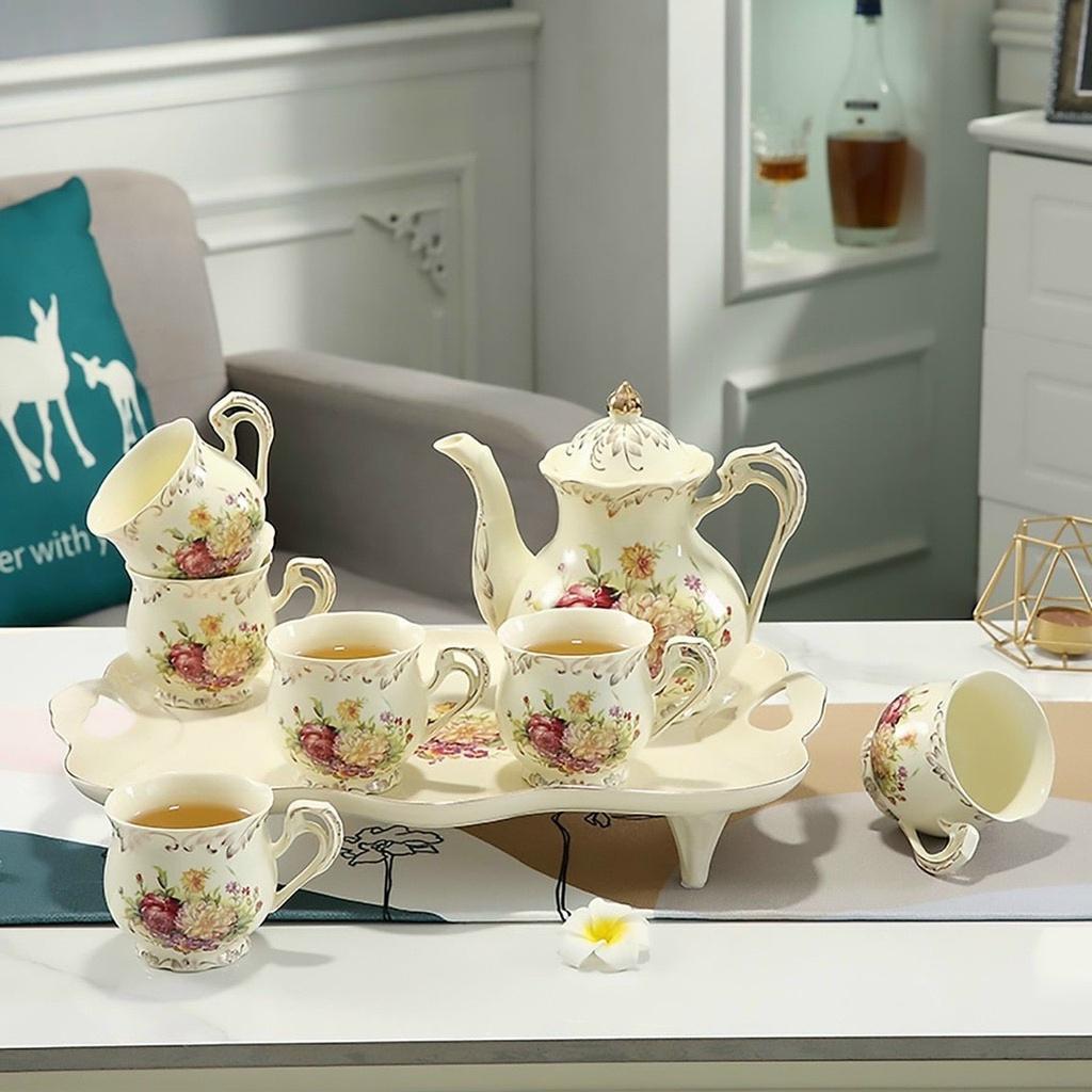 ✨BỘ ẤM CHÉN SỨ HOA MẪU ĐƠN THẤP PHONG CÁCH HOÀNG GIA KÈM KHAY VIỀN VÀNG CAO CẤP