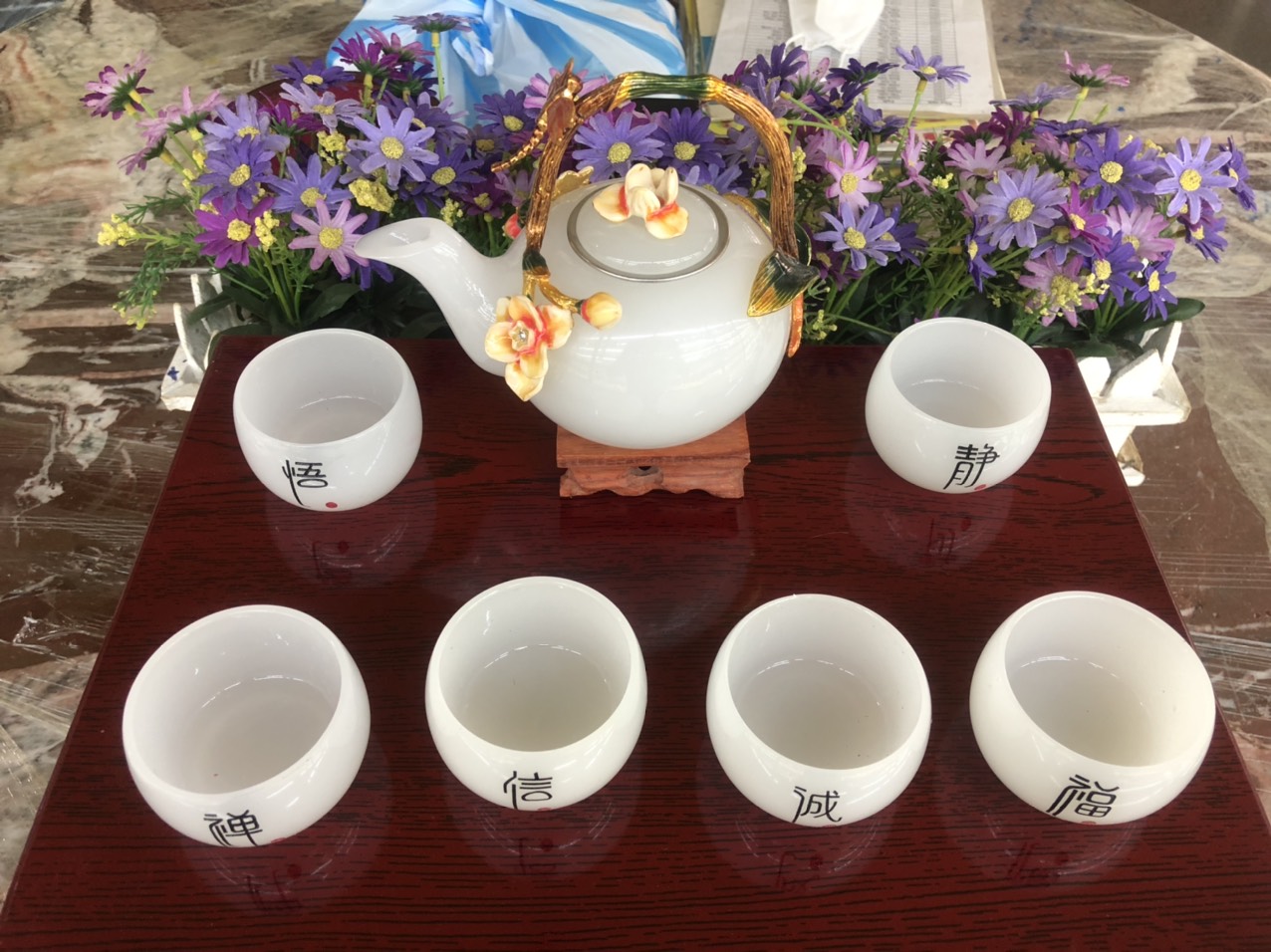 ✨Bộ ấm trà chạm hoa và con chuồn chuồn với quai xách đá bạch ngọc