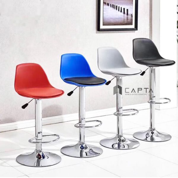Ghế bar pen ghế tăng giảm chiều cao từ 55 ~ 75 cm tiện lợi. Chân mâm thép mạ chrome sáng bóng sang trọng, màu kim loại bắt sáng. Kiềng gác chân hình bán nguyệt tạo thế khi lên xuống ghế và là điểm tựa gác chân khi ngồi.