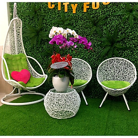 Bộ sản phẩm gồm : 01 bàn mặt kính + 02 ghế + 01 xích đu như hình
