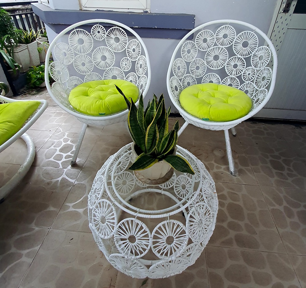 Chất liệu : sắt được tĩnh điện và được gia công sợi giả mây tăng tính thẩm mỹ và độ bền cao khi để ngoài trời