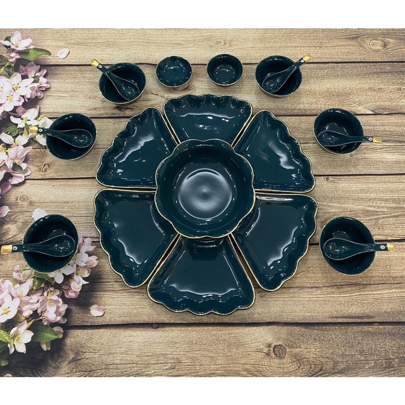 BỘ BÁT ĐĨA HOA MẶT TRỜI SEN XANH 18 CHI TIẾT - TRỌN BỘ gồm : - 1 Bộ 6 cánh đĩa + bát tô tạo hình bông hoa , đk cả bộ 45cm rất