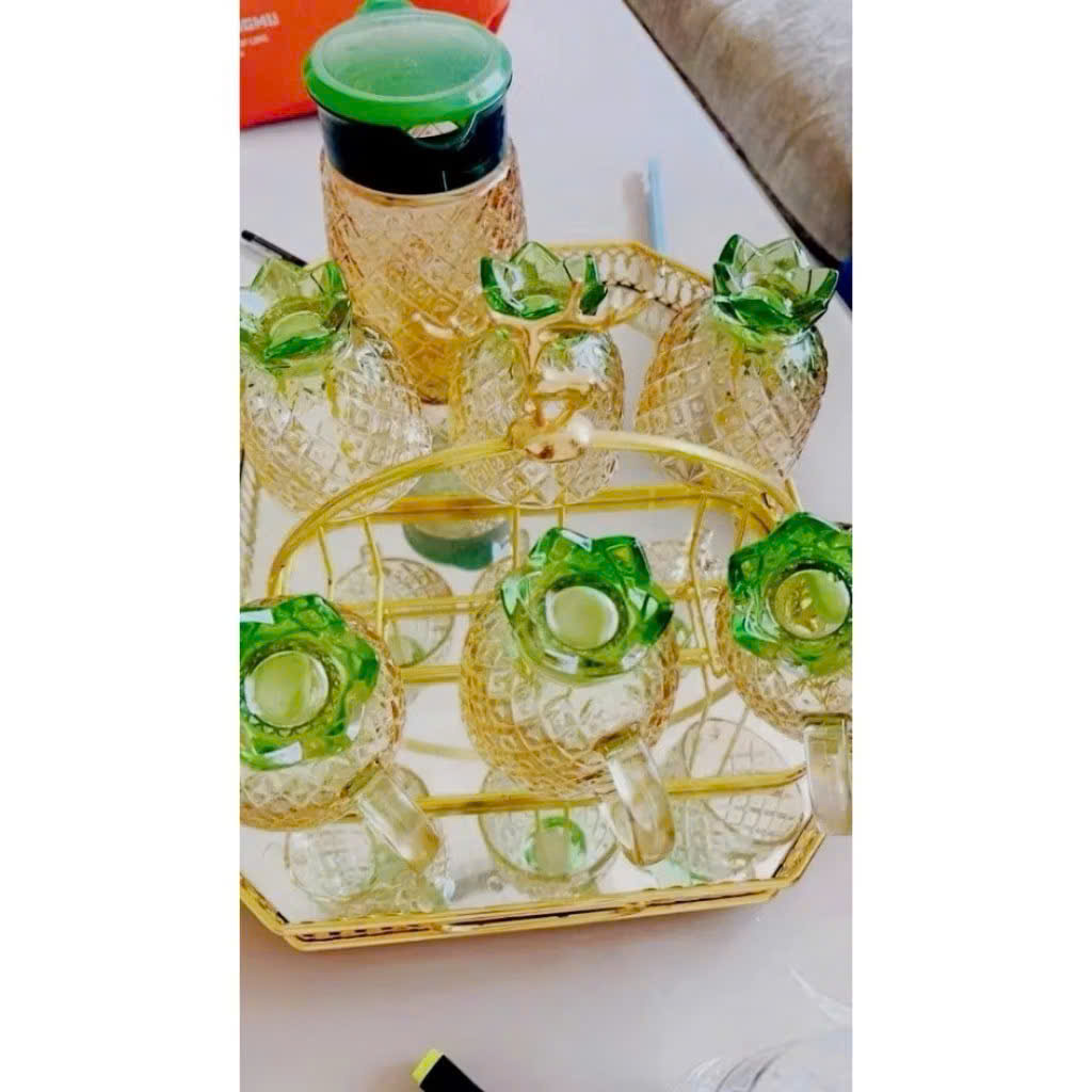 Bộ sản phẩm đầy đủ: Bộ sản phẩm bao gồm một bình thủy tinh lớn kèm theo 4 cốc ly hình quả dứa, đủ để phục vụ cho các bữa tiệc gia đình hoặc bạn bè, giúp bạn tạo ra một không gian thưởng thức đồ uống hoàn hảo.