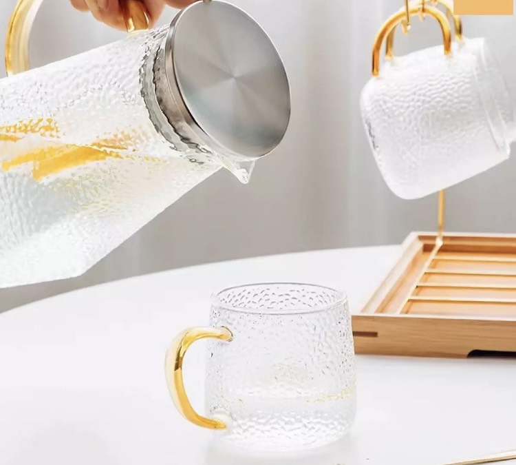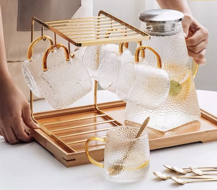 ✨BỘ BÌNH ĐỤNG NƯỚC UỐNG THỦY RINH ĐÁY VUÔNG VÂN DẬP NỔI KÈM 6 CỐC BẦU, KHAY VÀ GIÁ TREO CỐC -VD107