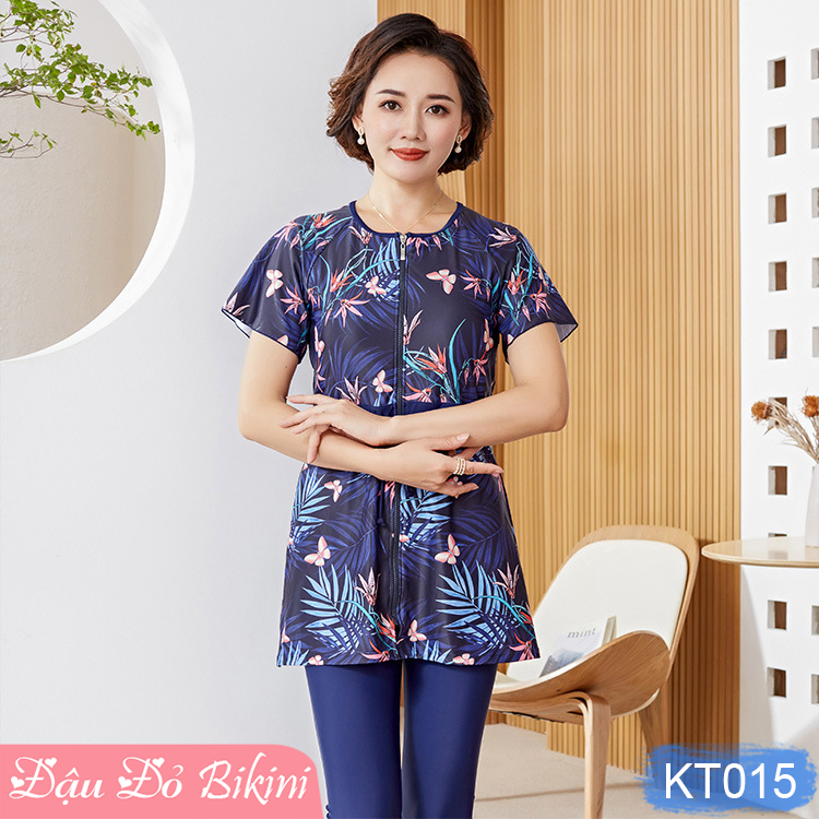 ✨Bộ bơi trung niên dáng váy có khoá kéo trước, quần bơi dài qua gối kín đáo, có size lớn cho các mẹ & các bà béo mập | KT015
