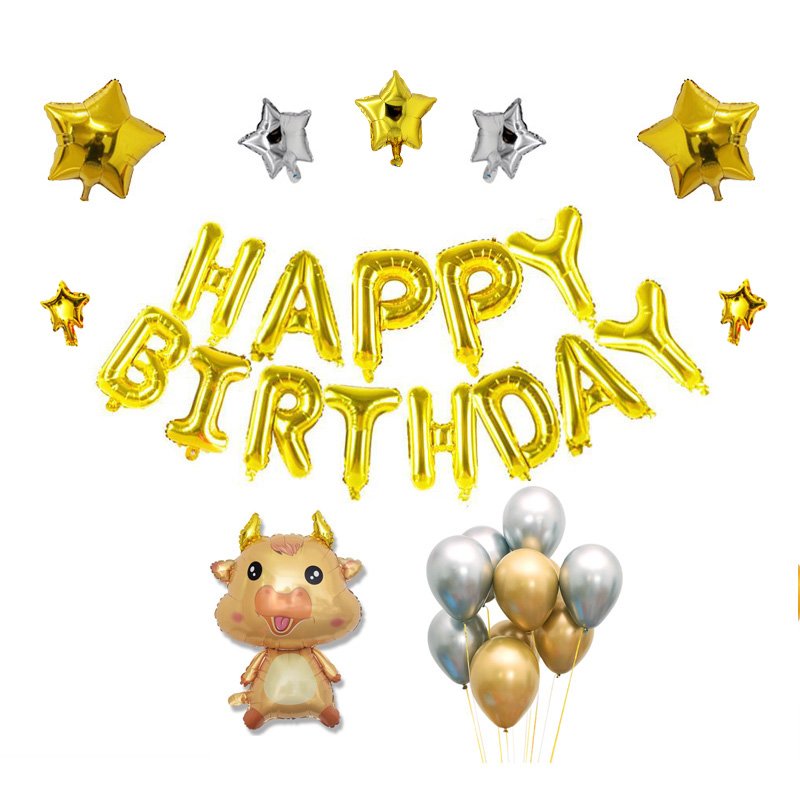 Gồm: - 1 bộ bong bóng chữ happy birthday - 1 bong bóng hình trâu vàng size lớn - 10 bong bóng siêu nhũ - 2 bong bóng hình ngôi sao 45cm - 3 bong