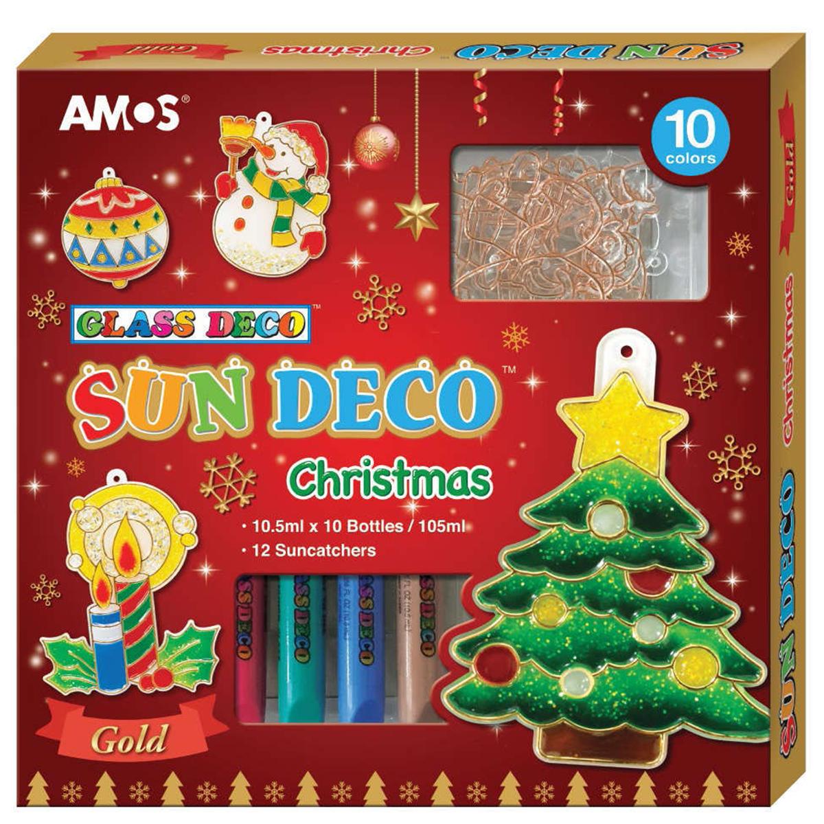 Bộ bút trang trí Sun Deco Christmas với 10 màu cơ bản của Thương hiệu AMOS nổi tiếng Hàn Quốc, an toàn cho trẻ theo tiêu chuẩn EU và ASTMD-42. Sản phẩm vẽ được lên các chất liệu như kính, gương hoặc lên các bề mặt khác, dễ tô, dễ sử dụng. Có thể sử dụng chung với các chất liệu khác để tô, tăng tính sáng tạo cho trẻ như bút nhũ, đất nặn…Sau khi thỏa sức sáng tạo với những gam màu vẽ độc đáo, tạo nên những Suncatcher, bé có thể sử dụng nó làm móc chìa khóa, trang trí cây Giáng sinh, di động, phụ kiện