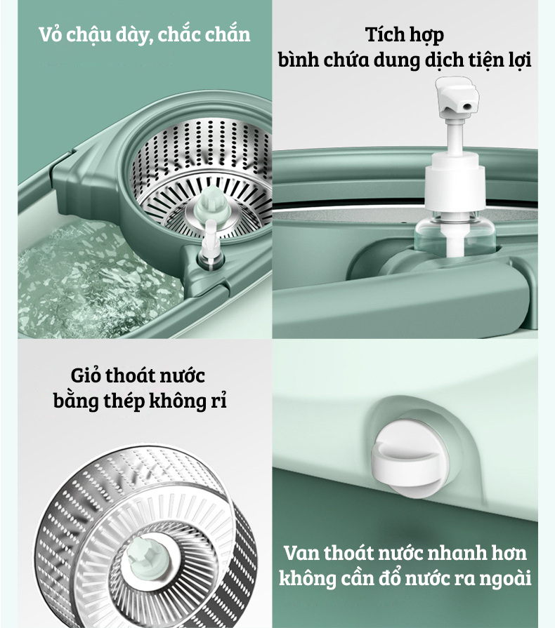 * Ưu điểm của sản phẩm: - Bộ Cây Lau Nhà Thông Minh Cao Cấp Phiên Bản Mới có thiết kế mới thông minh tiện lợi thùng vắt xoay tròn gồm: 1 khe để giặt