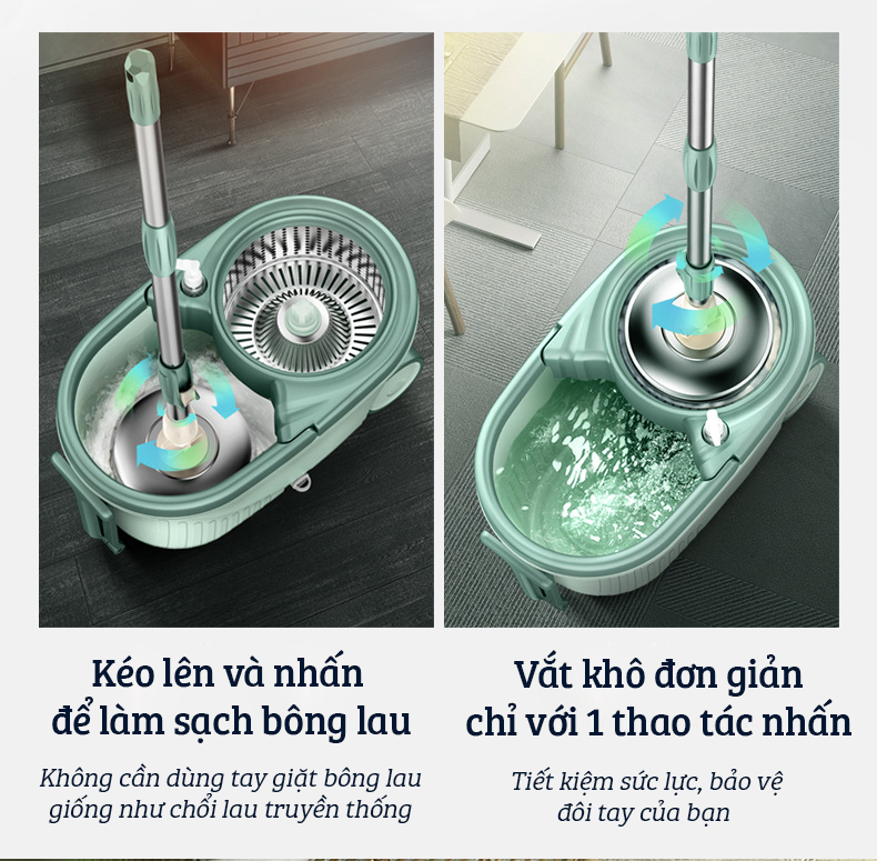 Bộ cây lau nhà xoay tay 360 độ MOP- L003 Màu sắc: Xanh lá cây Chất liệu : Nhựa, inox, sợi bông Kích thước: 49,5 x 31,5 x 30 (cm) -Lồng vắt bằng inox. Độ