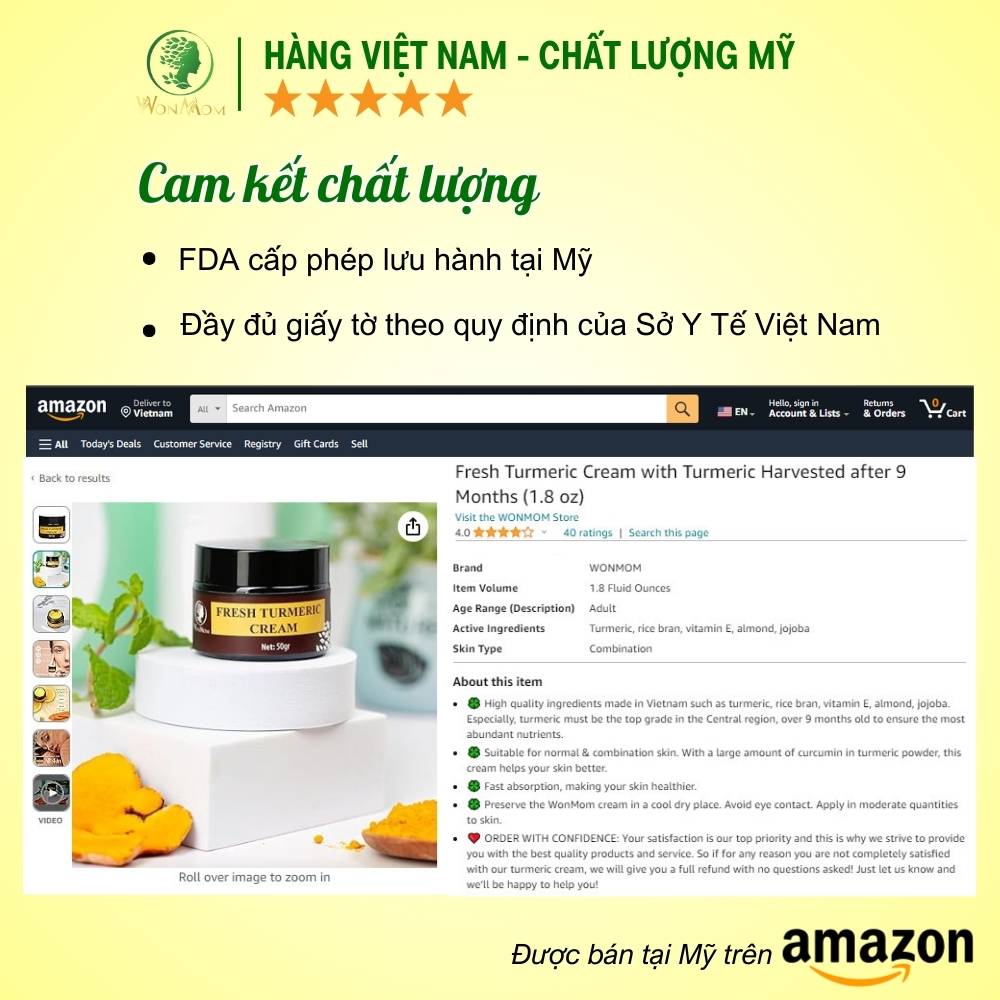 - Thành phần chính của nghệ là curcumin, trị thâm, liền sẹo, mang lại làn da tươi trẻ. Kem nghệ tươi dưỡng trắng da tự nhiên Wonmom 50g: