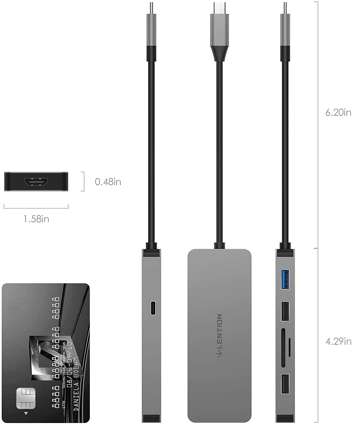 1. Input USB-C 2. Output 2 x USB 3.0, 1 x USB-C, 1 x 4K HDM Port, 1 x SD Card Slot, 1 x TF Card Slot 3. Dimension 115mm x 36mm x 12.5mm 4.