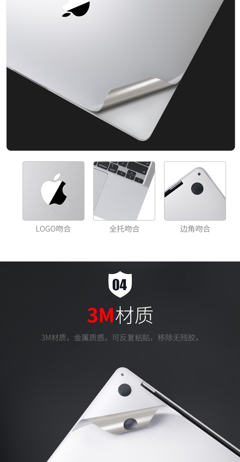 + Miếng dán chống xước, phủ lớp kim loại tản nhiệt tốt cho Macbook + Miếng dán bao quanh bàn phím máy và gồm 1 miếng dán phần di chuột trackpad + Màu cơ bản