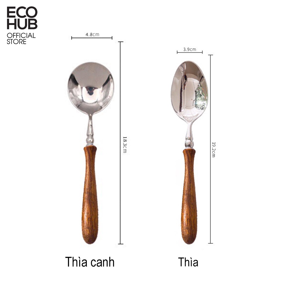 Bộ dao muỗng nĩa inox Cao Cấp, cán gỗ ECOHUB màu bạc sang trọng, Sử dụng cho nhà hàng cao cấp / cá nhân THÔNG SỐ: - Kích thước: - Muỗng: 19.2*3.9cm - Muỗng canh: