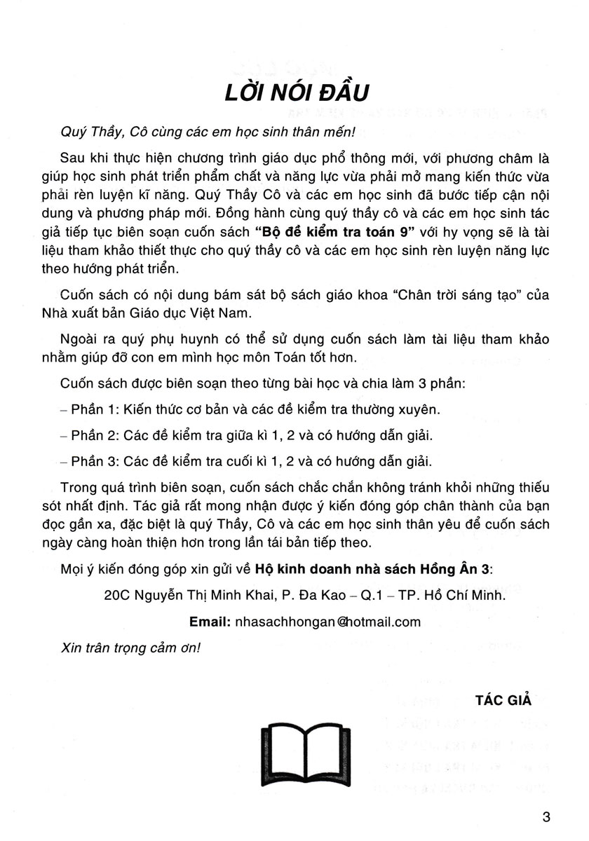 Bộ Đề Kiểm Tra Toán 9 (Bám Sát SGK Chân Trời Sáng Tạo) Sau một năm thực hiện Chương trình Giáo dục phổ thông mới, với phương châm là vừa giúp học sinh phát triển phẩm chất và năng lực vừa phải mở mang kiến thức vừa phải rèn luyện kĩ năng, quý Thầy Cô và các em học sinh đã từng bước tiếp cận nội dung và phương pháp mới. Đồng hành cùng quý thầy cô và các em học sinh, tác giả tiếp tục biên soạn cuốn sách “Bộ đề kiểm tra toán 9” với hy vọng sẽ là tài liệu tham khảo thiết thực cho quý thầy cô và các em học sinh rèn luyện năng lực theo hướng phát triển. Cuốn sách có nội dung bám sát bộ sách giáo khoa “Chân trời sáng tạo” của Nhà xuất bản Giáo dục Việt Nam. Ngoài ra quý phụ huynh có thể sử dụng cuốn sách làm tài liệu tham khảo nhằm giúp con em mình học môn Toán tốt hơn. Cuốn sách được biên soạn theo từng bài học và chia làm 3 phần. – Phần 1: Kiến thức cơ bản và các đề kiểm tra thường xuyên. − Phần 2: Các đề kiểm tra giữa kì 1, 2 và có hướng dẫn giải. − Phần 3: Các đề kiểm tra cuối kì 1, 2 và có hướng dẫn giải. Trong quá trình biên soạn, cuốn sách chắc chắn không tránh khỏi những thiếu sót nhất định. Tác giả rất mong nhận được ý kiến đóng góp chân thành của bạn đọc gần xa, đặc biệt là quý Thầy, Cô và các em học sinh thân yêu để cuốn sách ngày càng hoàn thiện hơn trong lần tái bản tiếp theo.