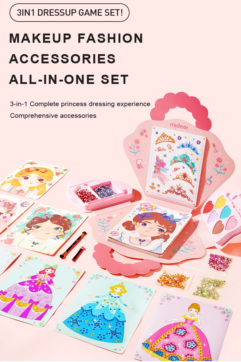 Bộ trang điểm Mideer bao gồm: 20 mẫu trang điểm công chúa, 4 mẫu nhãn dán kim cương, 4 mẫu nhãn dán sáng bóng, 4 nhãn dán, 6 màu, 900 viên kim cương, 10 chất liệu vải, 1 tấm, 1 bút đính cương, 1 keo dán, 2 cọ trang điểm