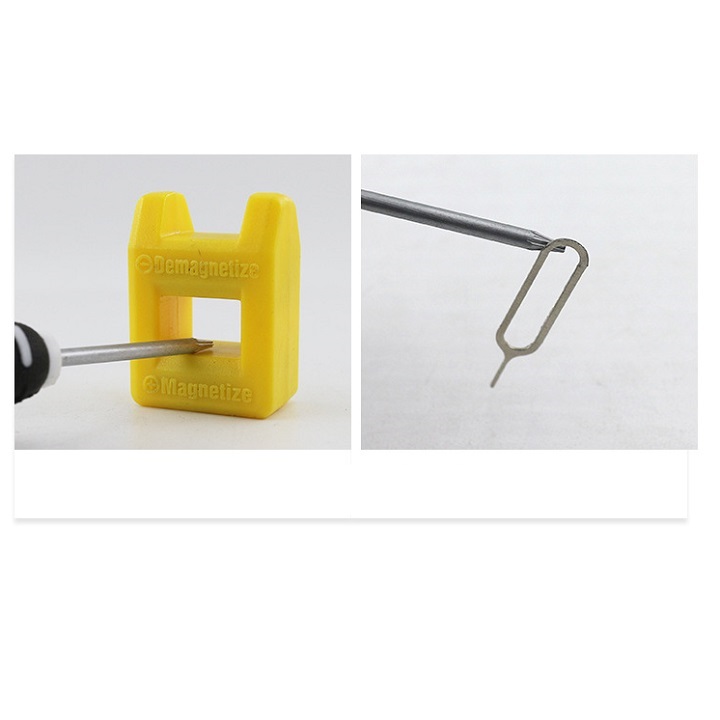- Cục nam châm vàng đi kèm Bộ đồ nghề sửa chữa điện thoại này có cả chức năng "nhiễm" và "khử" từ. Khách hàng lưu ý cho, riêng về chức năng khử từ, đây là sản phẩm "khử" theo nguyên lý cơ từ tường chứ không phải điện tử, nên shop không đảm bảo chuyện khử tuyệt đối 100%, mà chỉ khử phần lớn từ 60-90%. (sản phẩm hiệu quả trên kim loại thông thường, không có tác dụng với các sản phẩm khác cũng là nam châm vĩnh cửu)