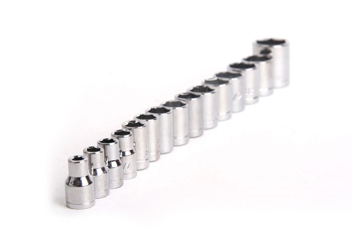 - 18 chi tiết 1/4”: 4.5, 5, 6, 7, 8, 9, 10, 11, 12mm & 1/2”, 7/16”, 3/8”, 11/32”, 5/16”, f9/32”, 1/4”, 7/32”, 3/16”