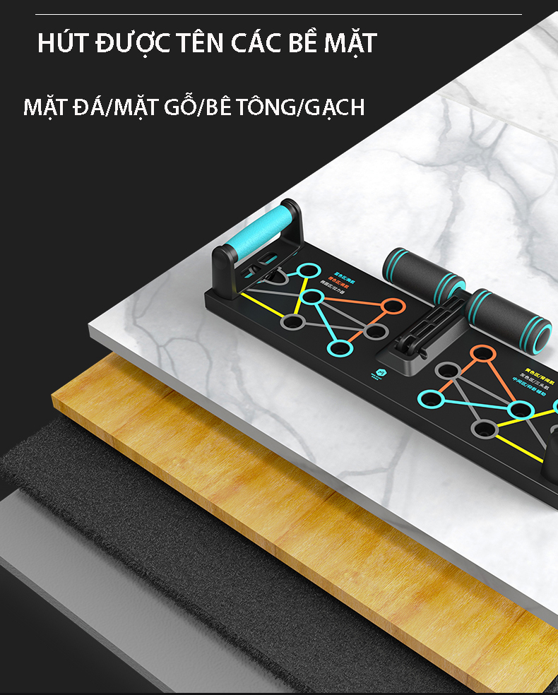 - Bảng tập chống đẩy có chân đế cao su kèm theo sử dụng trong trường hợp nền nhà trơn hoặc tránh xước gạch men.Sản phảm có thể dùng cho sàn đá,gạch,sàn bê tông,sàn gỗ.