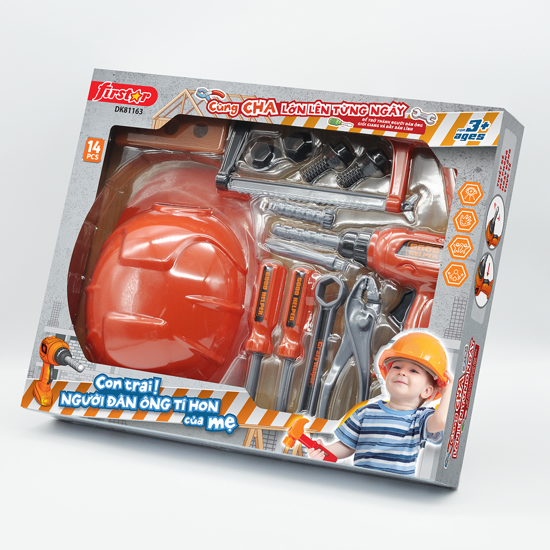 Bộ dụng cụ đồ chơi cho bé, DK 81163 Được mô phỏng với các dụng cụ cần thiết của các chú kỹ sư, công nhân, thợ cơ khíúp các bé trai tha hồ thỏa sức đóng vai và sáng tạo trong việc lắp ráp, sửa chữa các máy móc, đồ dùng vật dụng thường ngày. Thông qua trò chơi giúp bé định hướng nghề nghiệp và mang tới rất nhiều niềm vui cũng như kỹ năng hữu ích cho trẻ; Giúp trẻ bồi dưỡng nhận thức trực quan Phát triển sự phối hợp giữa tay và mắt Tăng cường ý thức trách nhiệm với cộng đồng Nhập vai và trải nghiệm cuộc sống Thông tin sản phẩm: