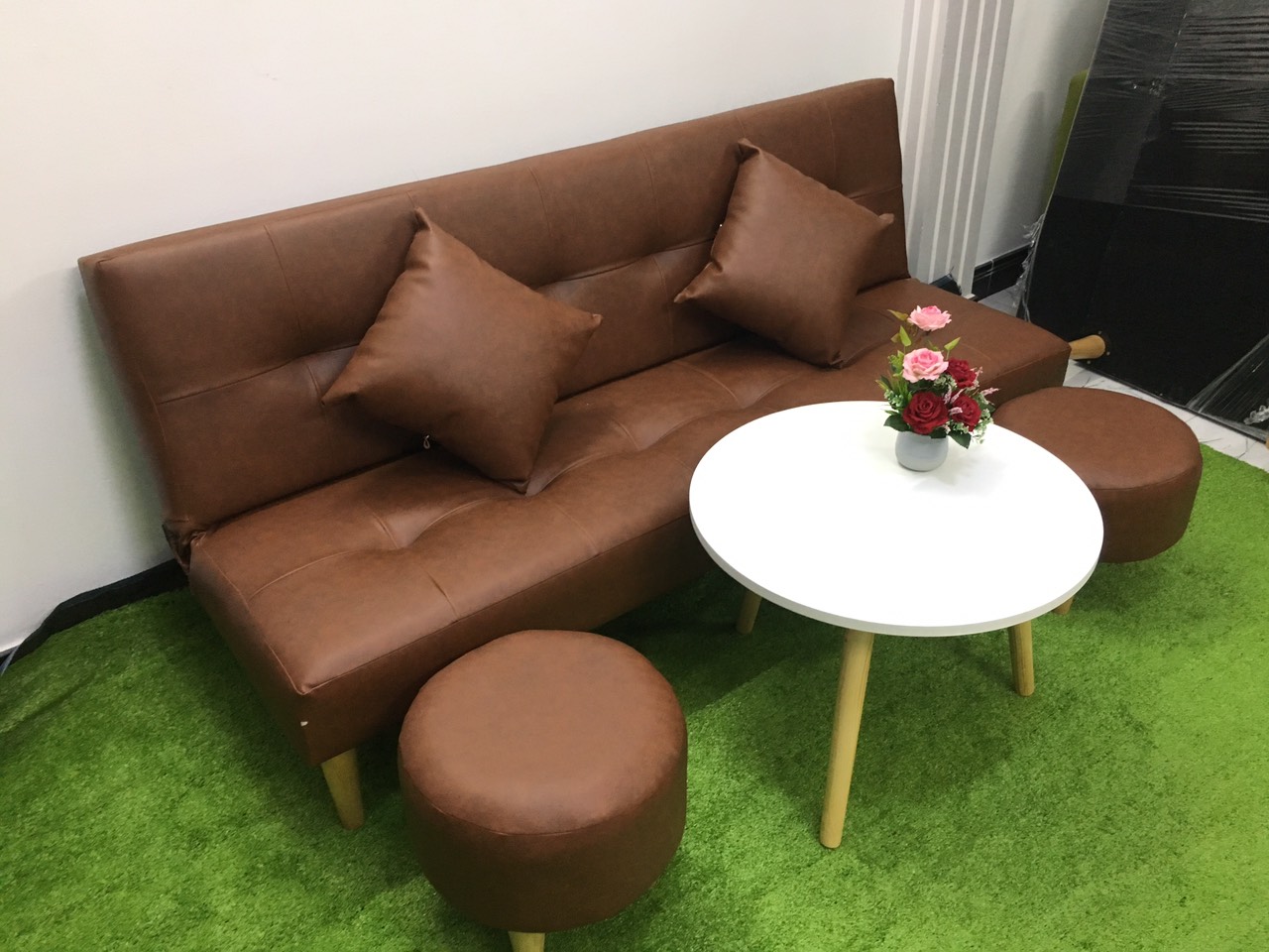 Sofa bed, sofa giường 1m7x90, có thể bật ra thành giường để nằm Kích thước 1m7x90 (kích thước phổ thông) Chất liệu: khung gỗ dầu, mút d30, simili Bao gồm: ghế dài 1m7x90, 2 gối ôm, 2 ghế đôn tròn, bàn tròn đường kính 60x45 The sofa can be unfold to be bed Size: 170cm x 90 including sofa bed, 2 cushions, 2 ottomans and white table