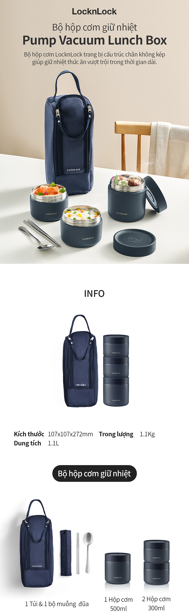 Bộ hộp cơm giữ nhiệt Locknlock Pump Vacuum Lunch Box 300mlx2, 500mlx1, bộ đũa và thìa, túi LHC8052S0