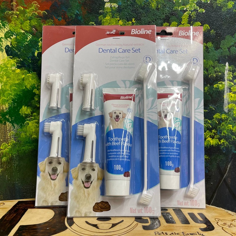 Bộ Kem đánh răng cho chó Bioline 100g + Bàn chải gồm: - 1 tuýt kem đánh răng 100g - 1 bàn chải răng 2 đầu - 2 ngón tay cọ răng ƯU ĐIỂM: -