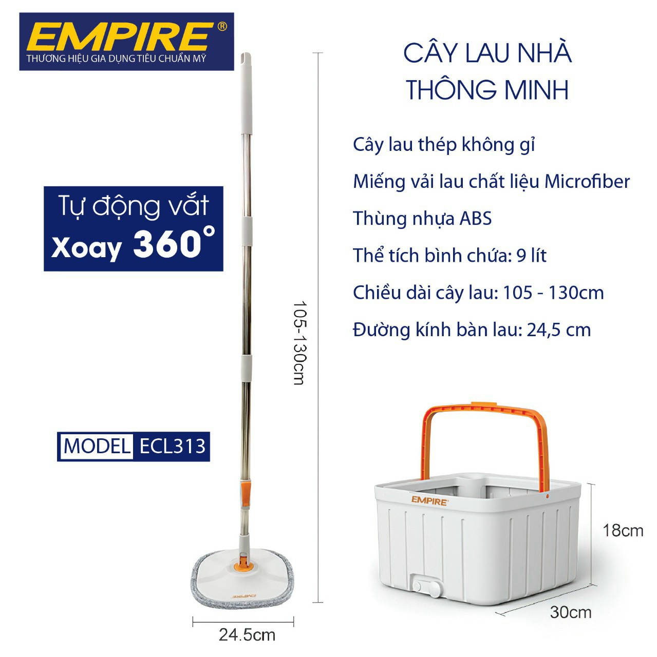 Bộ lau nhà hai ngăn tiết kiệm nước tự vắt thông minh Empire 313 thế hệ mới. Tính năng tiết kiệm nước bằng nguyên lý chia hai ngăn nước sạch, và ngăn chứa nước