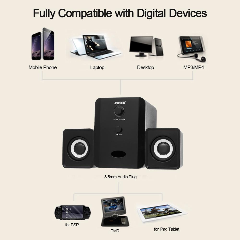 - Three high-performance speakers set. Exquisite design. Lightweight and portable, convenient to carry. Specification: Brand Name: SADA Model Number: D-201 BT Version: V4.2 Effective Distance: 10m/33ft Frequency Response: 25Hz-20KHz Output Power: 3W Power Supply: DC 5V Input Interface: USB Plug 3.5mm Audio Plug Separation: 40dB SNR: 80dB Material: Plastic Color: Black USB Cable Length: 1m/3.3ft Audio Cable Length: 1m/3.3ft Main Speaker Size: 12611595mm/4.964.523.74in Sub Speaker Size: 726262mm/2.832.442.44in Speakers Weight: 563g/19.88oz Package Size: 23.515.513.0cm/9.256.105.11in Package Weight: 671g/23.67oz Package List: 1 Set of Wired Speaker (3 speakers a set) 1 User Manual