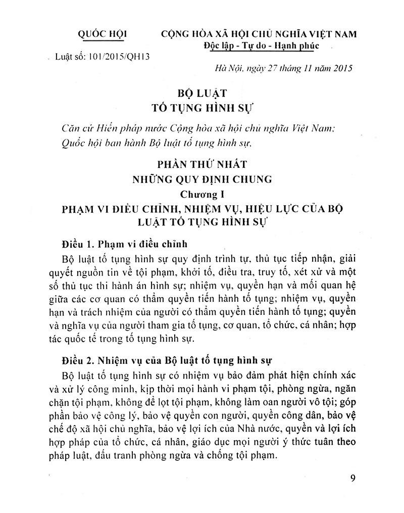 LỜI GIỚI THIỆU Bộ luật Tố tụng hình sự số 101/2015/QH13 ngày 27 tháng 11 năm 2015 của Quốc hội, có hiệu lực kể từ ngày 01 tháng 7 năm 2016, được sửa đổi,