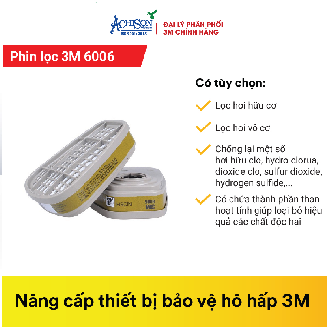 PHIN LỌC 3M 6006: Công Dụng: Hỗ trợ bảo vệ hô hấp cho người lao động trong quá trình làm việc tại môi trường ô nhiễm, độc hại, có hóa chất, phân bón Mô Tả: Giúp hỗ trợ bảo vệ hô hấp cho người lao động làm việc trong môi trường có nhiều hơi hữu cơ nhất định, cl0, h.y.dr0 cl0r.u.a, d.i.0.x.i.d.e. cl0, s.u.l.f.u.r di0x.i.de, h.y.d.r.0.g.en s.u.l.fide, .a.m.0.n.iac, m.e.t.h.y.l.a..m.in.e, f.0.r.m..a.l.d.ehyde hoặc hyd.r..0.g.en fluoride. Được dùng với mặt nạ nguyên mặt và nửa mặt series 6000, 7000 và FF-400. Sản phẩm là một trong những trang bị không thể thiếu đối với mội người lao động. Tiêu Chuẩn: NIOSH Kích thước: 3.4 x 4.2 inch -----------------------------