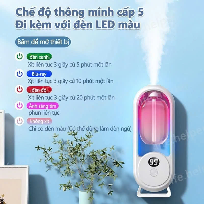 Năm chế độ phun hương thơm: • Chế độ 1 Ánh sáng xanh: Phun tinh dầu 3 giây chu kỳ liên tục 5 phút một lần. • Chế độ 2 Ánh sáng xanh: Phun tinh dầu 3 giây chu kỳ liên tục sau mỗi 10 phút. • Chế độ 3 Ánh sáng đỏ: Phun tinh dầu 3 giây chu kỳ liên tục 20 phút một lần. •Chế độ 4 Ánh sáng tím: phun liên tục. • Chế độ 5 _ Đèn màu: Đèn led, Không phun.
