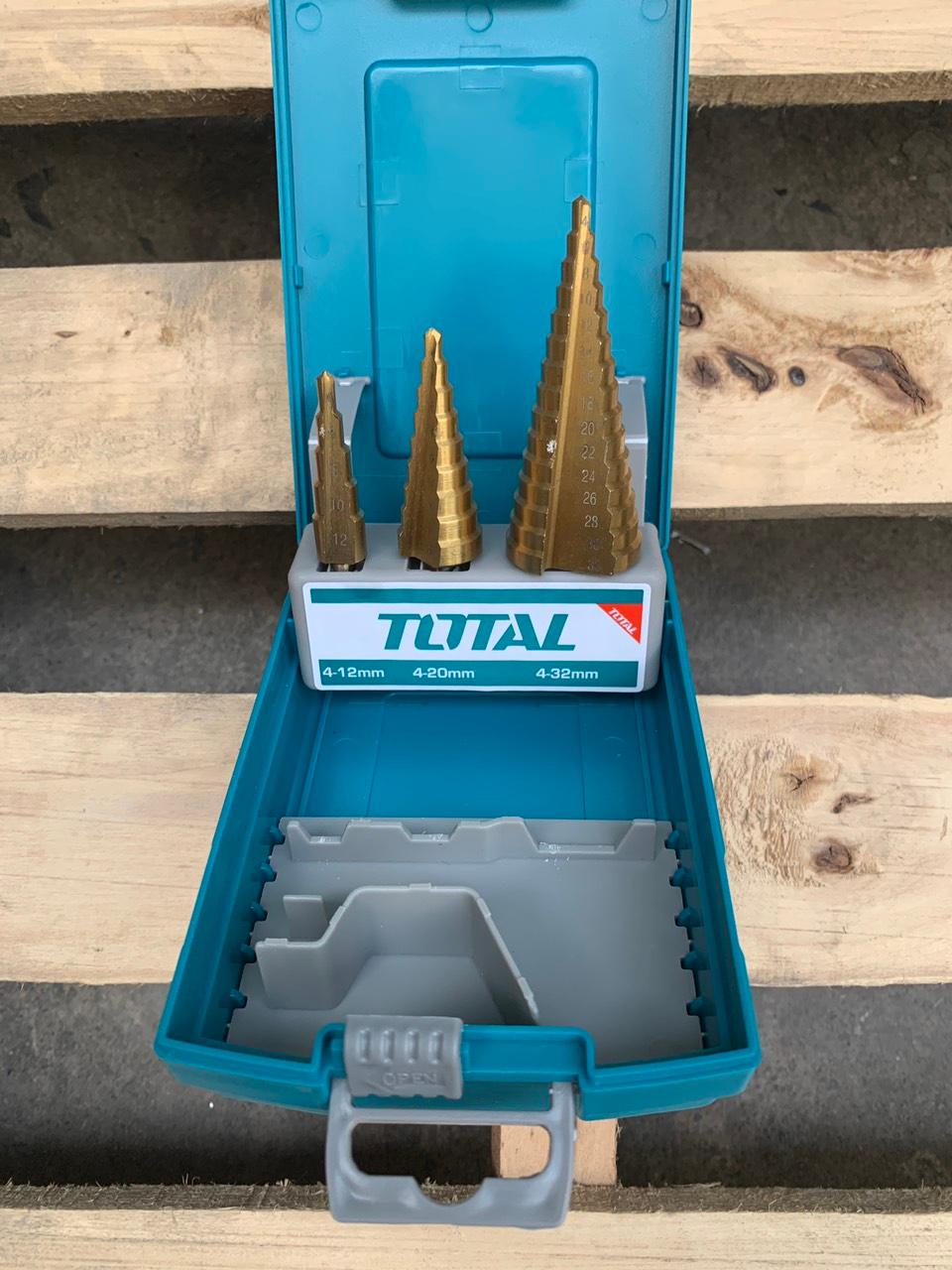 -Bộ 3 mũi khoan chóp nón gồm:1 pcs 4-12 mm, 1mm/bậc , đk đuôi: 6mm. 1 pcs 4-20 mm, 2mm/bậc , đk đuôi: 8mm