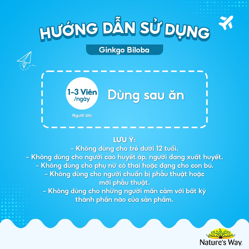 Bổ não Ginkgo Biloba Nature's Way úc giúp tăng tuần hoàn máu não, cải thiện chức năng nhận thức, trí nhớ, giúp an thần và giảm stress         1.Giới thiệu bổ não Ginkgo Biloba Nature's Way Úc        - Phân Loại: Bổ não Ginkgo Biloba        - Thương hiệu: Nature's Way        - Xuất xứ: Úc        - Đóng gói: 120 viên/hộp          Nature's Way High Strength Ginkgo Biloba có thể giúp thúc đẩy quá trình lưu thông máu khỏe mạnh đến các vùng ngoại vi của cơ thể (chân, tay và bàn chân) và hỗ trợ trí nhớ.         2.Công dụng bổ não Ginkgo Biloba Nature's Way Úc        - Duy trì sức khỏe não bộ, hệ thần kinh, hỗ trợ giảm thiểu các hội chứng đau đầu, chóng mặt, mệt mỏi        - Hỗ trợ tăng cường trí nhớ và chức năng nhận thức, giúp tập trung,        - Hỗ trợ tăng tuần hoàn hệ thần kinh ngoại biên, giảm thiểu các triệu chứng đau cứng cổ, vai, gáy, tê nhức chân        - Hỗ trợ ngăn ngừa thiếu máu não, tăng cường tuần hoàn, hỗ trợ ngủ ngon.        - Sử dụng sớm còn giúp hạn chế mắc bệnh Alzheimer khi ở tuổi già.   Bao bì mẫu mã thay đổi theo từng đợt nhập hàng         3.Thành phần bổ não Ginkgo Biloba Nature's Way Úc        - Gingko biloba (Gingko) 40 mg        - Equiv. Bạch quả khô 2 g        - Nature's Way High Ginkgo Biloba được chiết suất từ 2000mg lá cây bạch quả tương đương 40mg         4.Đối tượng bổ não Ginkgo Biloba Nature's Way Úc        - Người suy giảm trí nhớ đau vai gáy, thiểu năng tuần hoàn não, hội chứng tiền đình đâu đầu, hoa mắt chóng mặt, mất ngủ, mệt mõi         5.Cách sử dụng bổ não Ginkgo Biloba Nature's Way Úc        - 1 viên/ lần, 1-3 lần/ngày hoặc theo lời khuyên của chuyên gia chăm sóc sức khỏe của bạn         6.Cách bảo quản bổ não Ginkgo Biloba Nature's Way Úc        - Bảo quản nhiệt độ phòng dưới 25 độ C, nơi khôn ráo, tránh ánh nắng trực tiếp, tránh va đập mạnh.        - Tránh xa tầm tay trẻ em         7.Một số câu hỏi thường gặp bổ não Ginkgo Biloba Nature's Way Úc         - Chúng tôi luôn quan tâm hàng đầu đến sức khỏe của bạn.        - Sản phẩm này không phải là th uốc và không có tác dụng thay thế thuốc chữa bệnh        - Cam kết hàng nhập khẩu chính hãng 100'/.        - Các sản phẩm của shop đều được kiểm tra (giấy tờ xuất xứ và giấy Công bố sản phẩm do Cục An Toàn Thực Phẩm cấp) khi trình duyệt đăng bán sản phẩm.        - Ngoài ra shop xuất có xuất hóa đơn VAT khi khách yêu cầu.        - Để liên hệ vui lòng nhắn tin vào hộp thư “Chat”