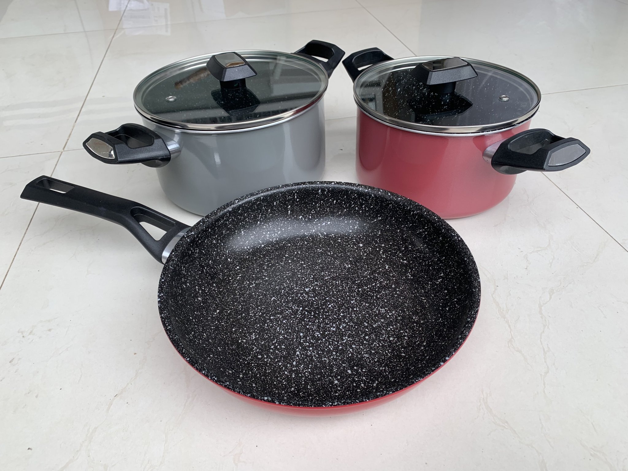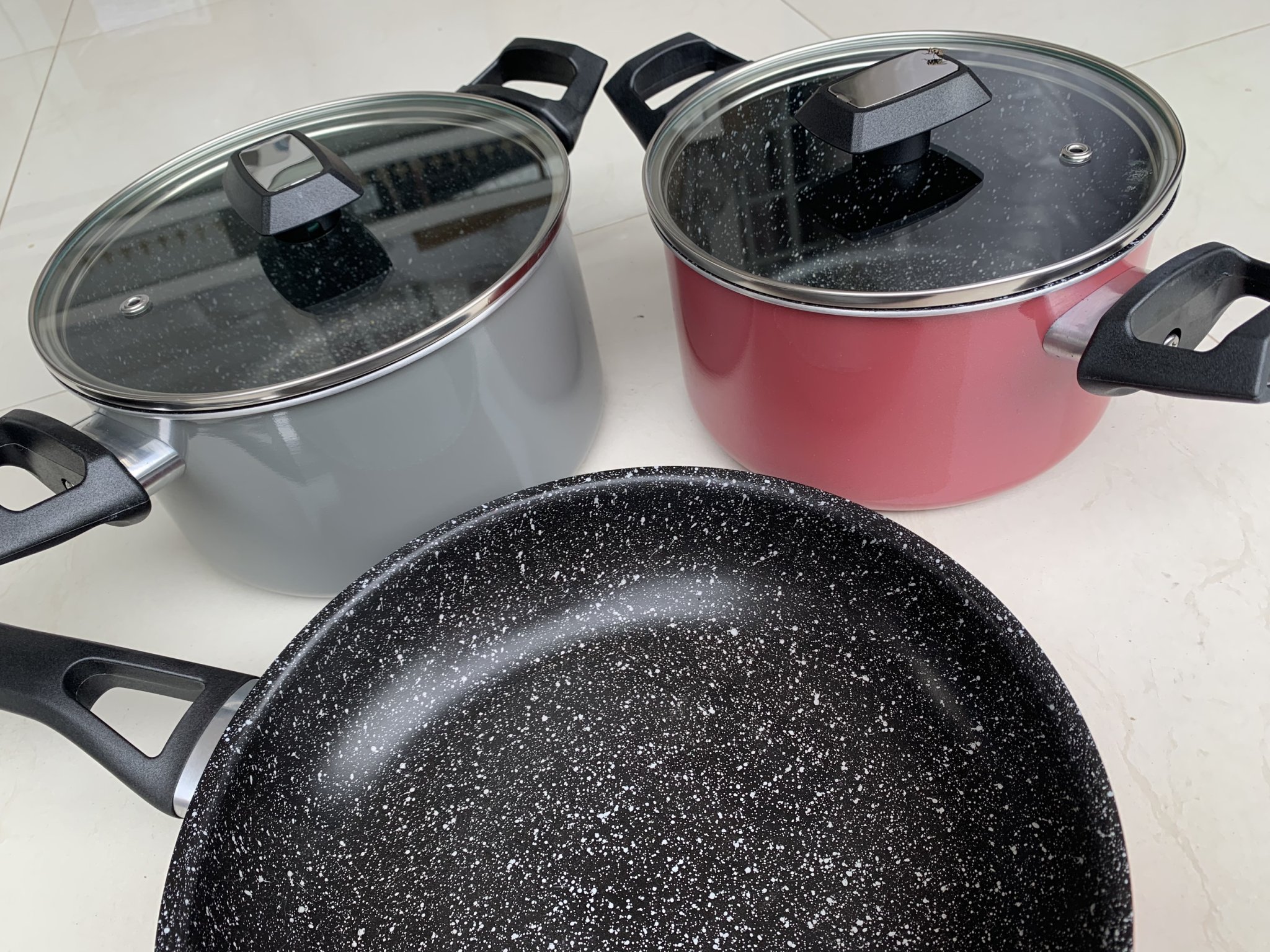 Là bộ nồi cao cấp với màu sắc cực sang, được làm từ chất liệu thân nhôm đúc dày và phủ đá cẩm thạch 3 lớp chống dính.  Thân nhôm đúc dày mang lại khả